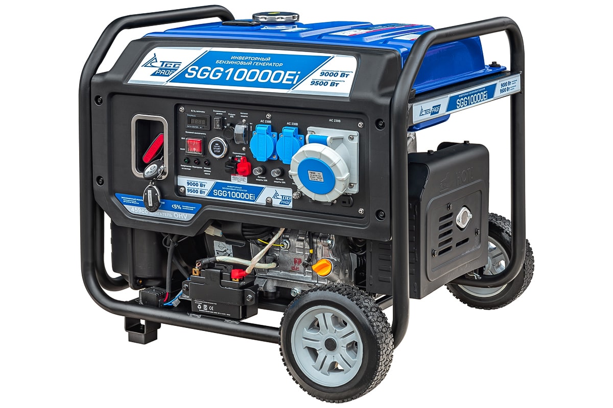 Профессиональный инверторный бензиновый генератор SGG 10000Ei с электростартом и разъемом для подключения блока автоматики. Укомплектован колесным комплектом для удобства перемещения.