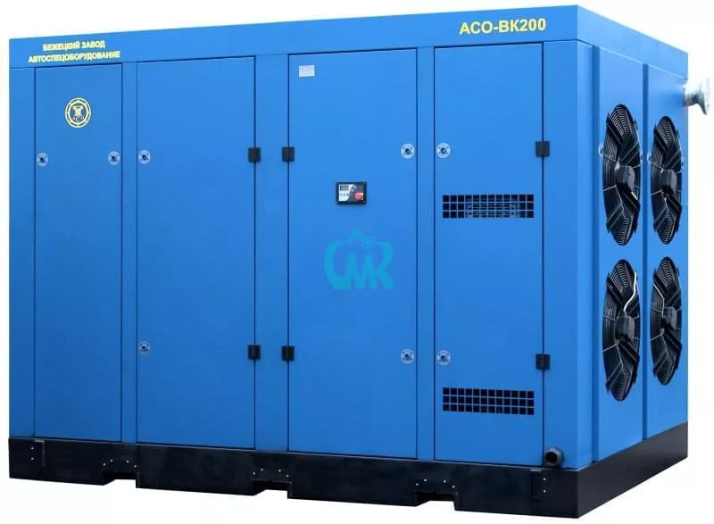 Стационарный винтовой компрессор АСО-ВК200/8(10) Бежецкого завода АСО рассчитан на производительность 32/30 м3/мин и максимальное давление 8/10 атм. Винтовой блок СF180R, привод 200 кВт. Уровень шума 76-80 дБа. Температура воздуха на всасывании в диапазоне от 10 до 45°С, температура воздуха конечная (после газоохладителя) не более 50 °С. Количество масла в маслосистеме 90 л, расход масла на унос, не более 10 г/час, содержание масла в сжатом воздухе, не более 5 мг/м3. Габариты 310 х 210 х 220 см, масса 4200 кг.